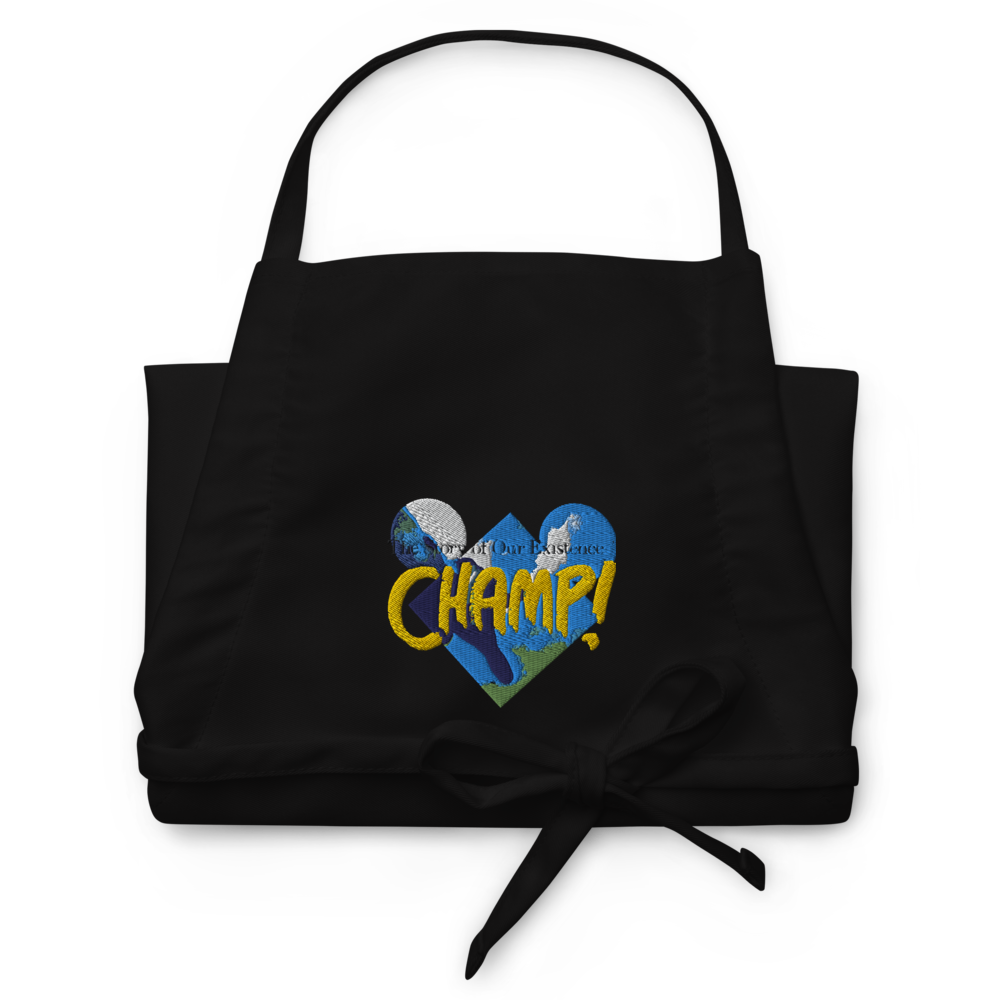 Let the clutch neck loop, long ties, two front pockets, and intricate "CHAMP!" embroidery support and inspire you for your next meal.